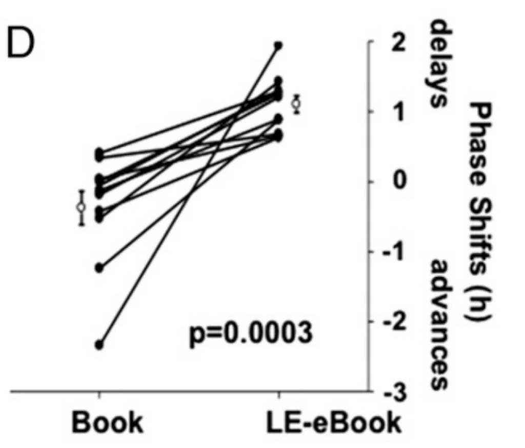 LE 电子书阅读将褪黑素开始分泌时间 DLMO (dim light melatonin onset)延迟 1.5 小时,造成生物钟后移
